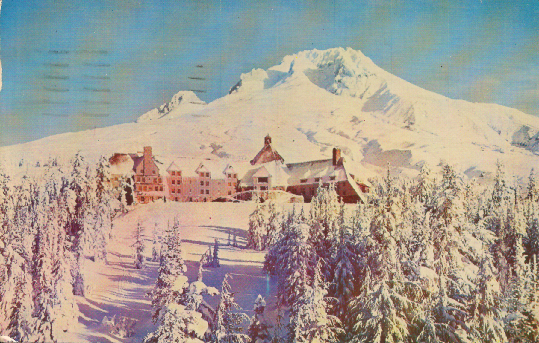 This postcard, showing Timberline Lodge on a sunny winter day, was