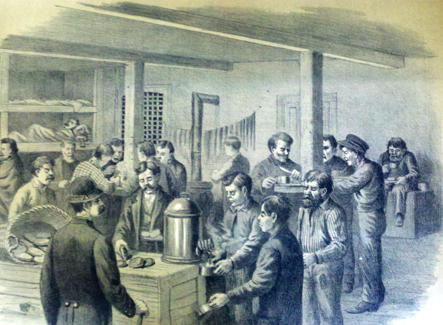 A lithograph of the scene on a bleary Saturday morning in the Portland