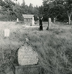 Frederic Balch’s gravestone, in the Lyle Cemetery; it’s a natural rock, not a shaped piece, which Balch picked out himself before his death. In the background, a man pays his respects at the grave marker of Genevra Whitcomb. (Image: Oregon Historical Society)