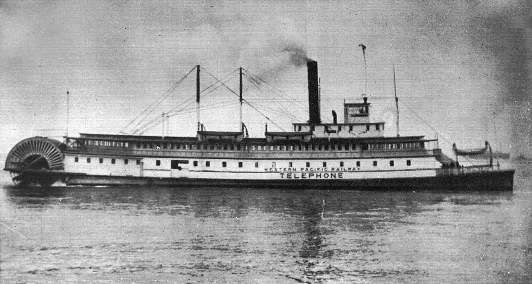 The sternwheeler Telephone under way in San Francisco Bay, long after the vessel caught fire on the Columbia; the entire superstructureshown in this photo was built after the fire. The once-proud riverboat ended up in San Francisco Bay as a railway ferry for a time before being scrapped in 1918. (Photo: Superior Publishing)